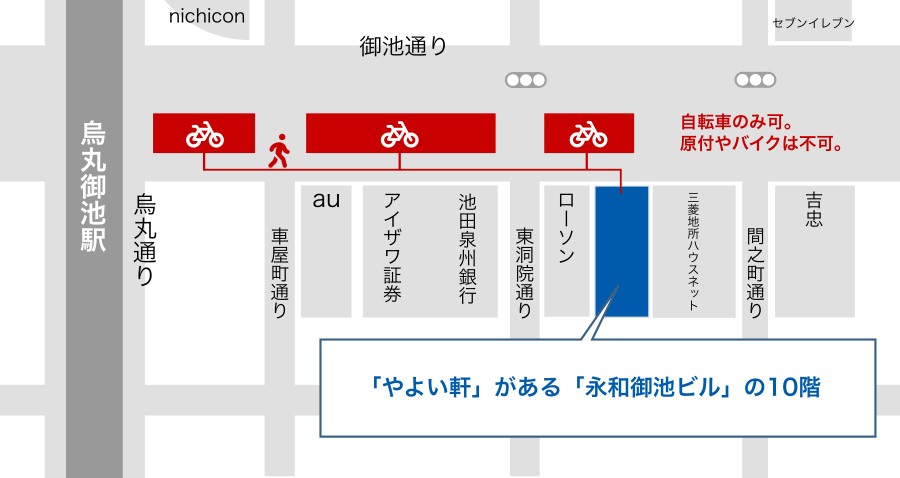 専用駐輪場や提携駐輪場はありません。永和御池ビル前の御池通まちかど駐輪場をご利用ください。御池通まちかど駐輪場が満車の際は近隣の駐輪場をご利用ください。ビル内への自転車の持ち込みは一切禁止ですのでご注意ください。