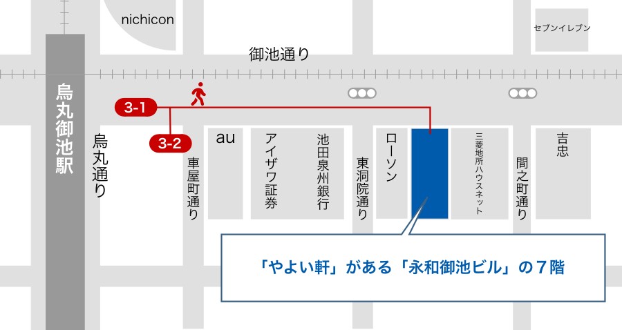 会場までの道のりは下記グーグルマップをご利用の上、1階に「やよい軒」さんがある「永和御池ビル」の7階にお越しください。